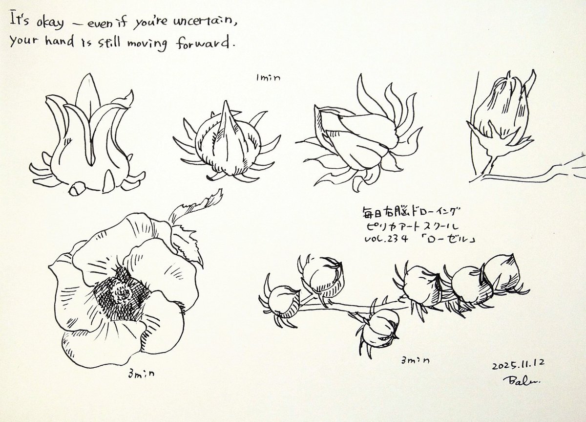 ピリカアートスクールさんの #毎日右脳ドローイング チャレンジ! 『ローゼル』 初めて見る植物🧐 面白い形の実だなぁ!! お花は芙蓉に似てる👀✨️ 線を減らしたら花びらの柔らかさ出たかも! DAISO万年筆 #日々描く pic.x.com/wGdNWwD3vC x.com/balu0517/statu…